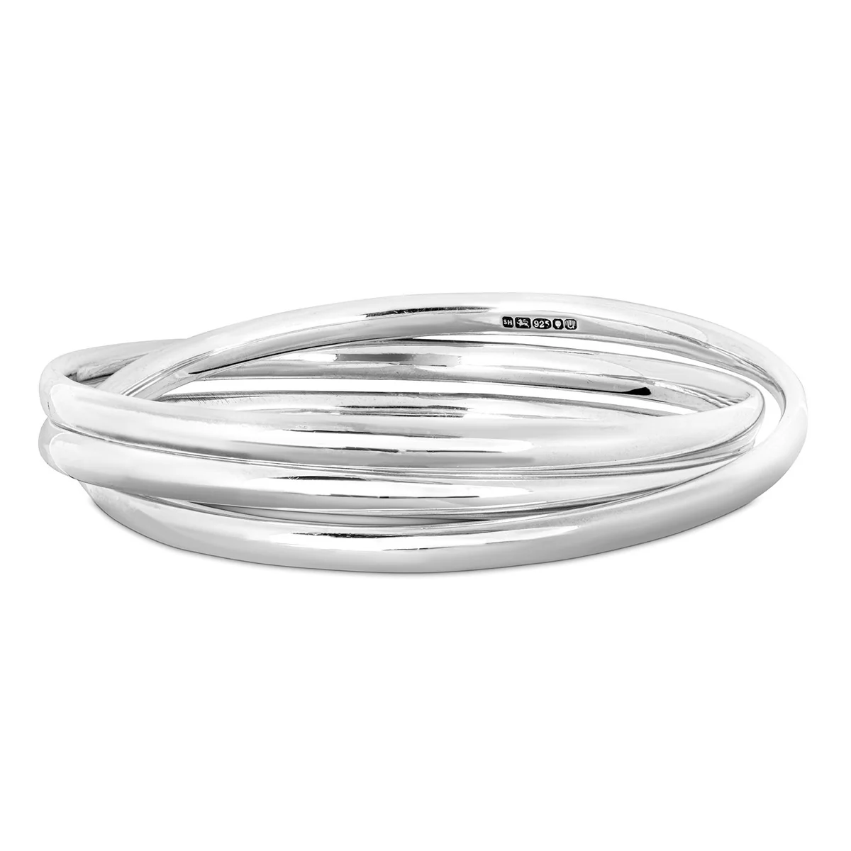 Three interlocking bangles in solid 925 sterling silver, inspired by traditional Russian wedding rings. Fully hallmarked at the London Assay Office.