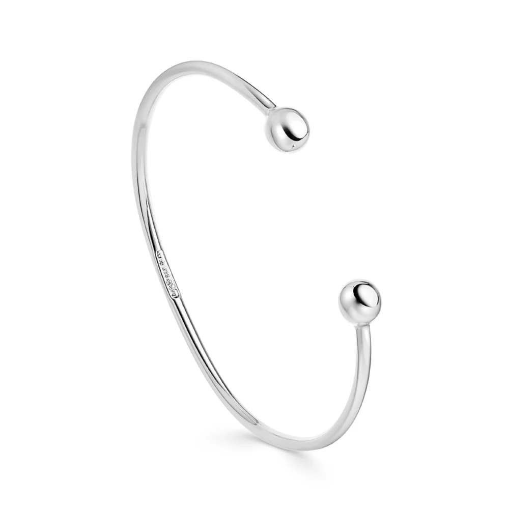 Ladies sterling silver torque bangle with ball ends, available in a slim, lightweight design for everyday wear.