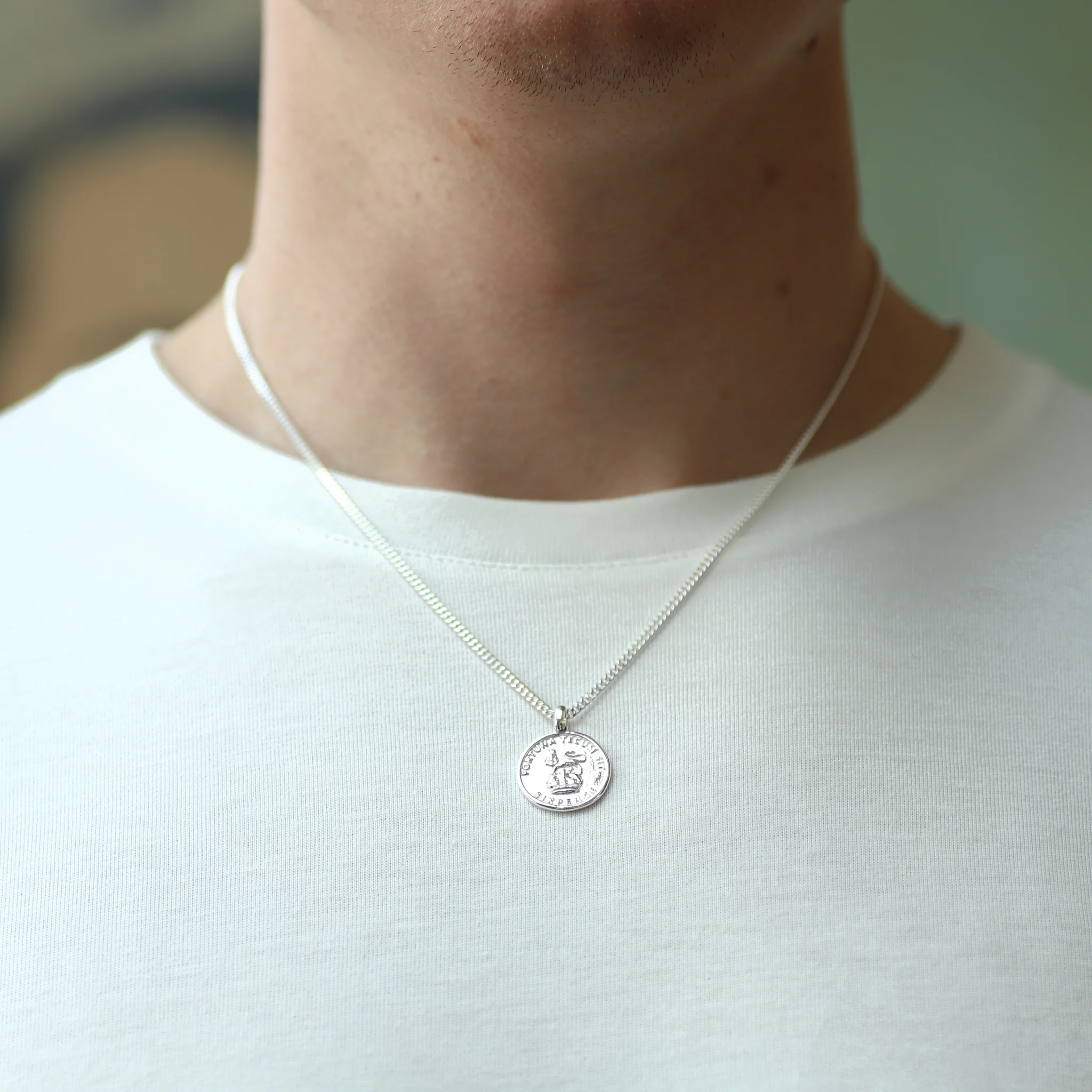 A perfectly imperfect sterling silver sixpence pendant necklace, with raised lettering in Latin "FORTUNA TECUM SIT", translated as "May luck be with you".