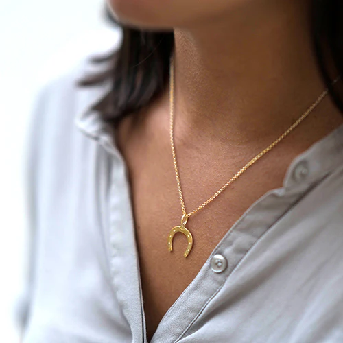 This horseshoe pendant necklace is made from sterling silver and plated with yellow gold. The pendant measures 14mm × 16mm.