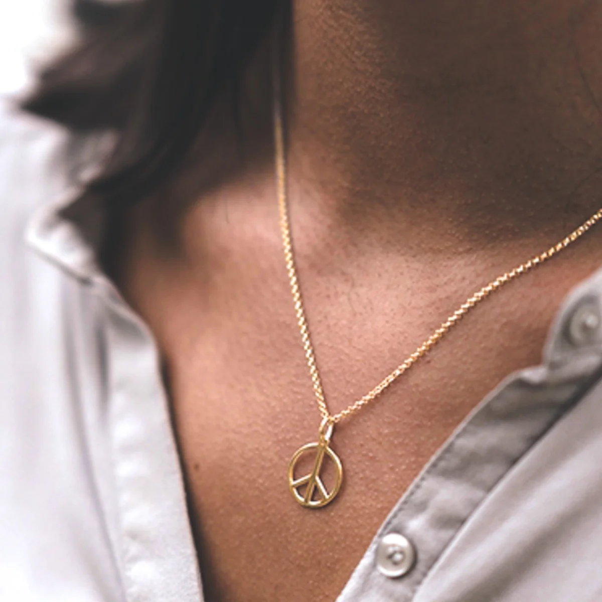 This peace symbol necklace is made from sterling silver and plated with 18ct yellow gold. The pendant measures 16mm in diameter.